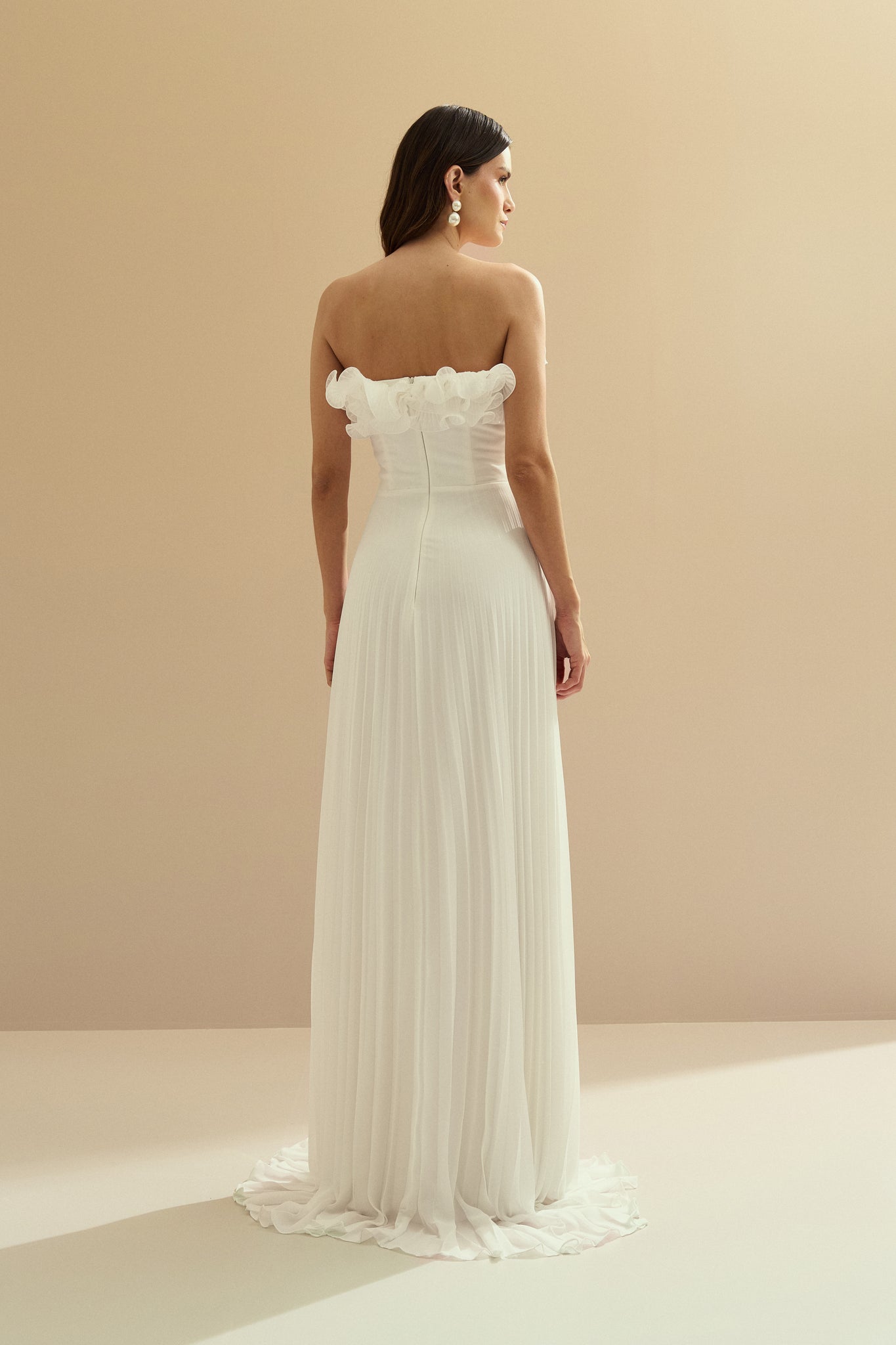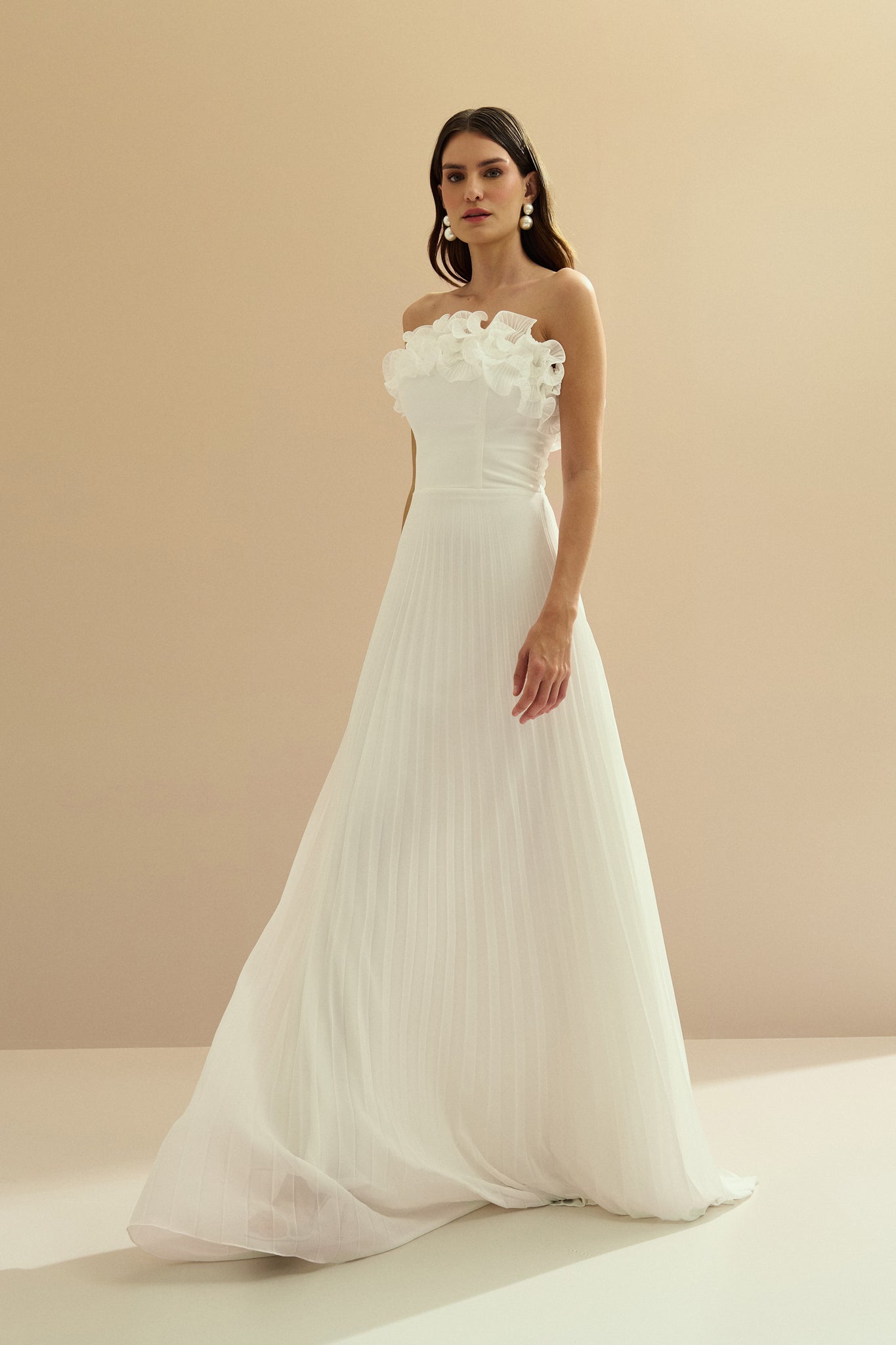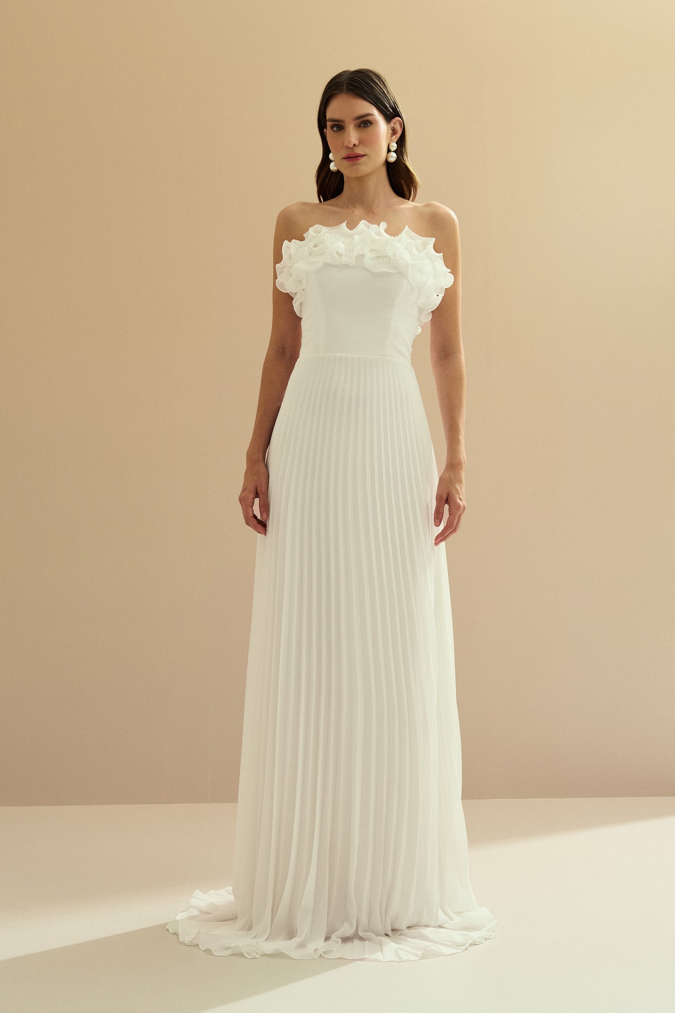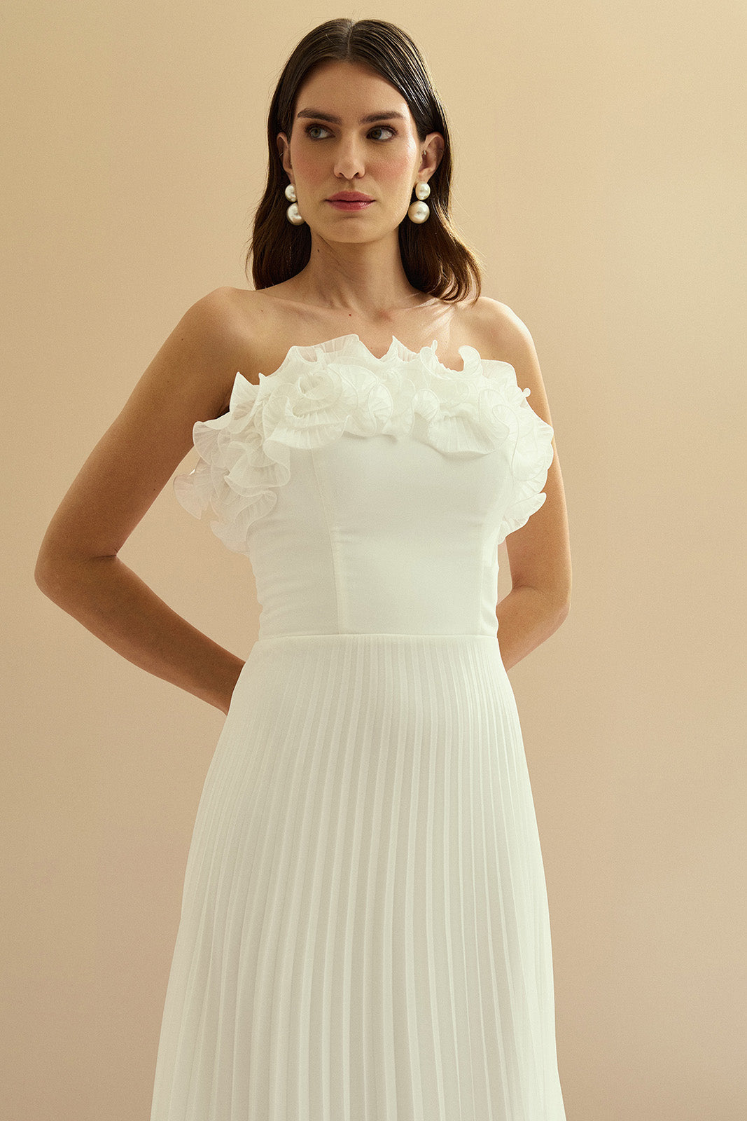 Vestido Longo de Chiffon Sem Alça, com Babados Plissados no Busto, Cintura Marcada e Saia Plissada - Âmbar Off White